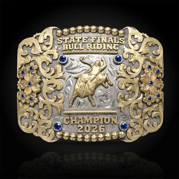 Lettering, figure, and stone colors are fully customizable, making the Gillette Belt Buckle a versatile option that can be designed for rodeos, associations, awards, or any special occasion.